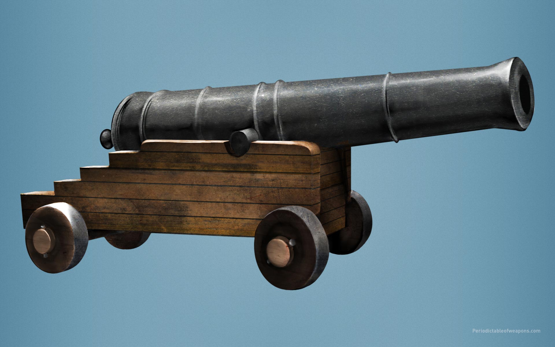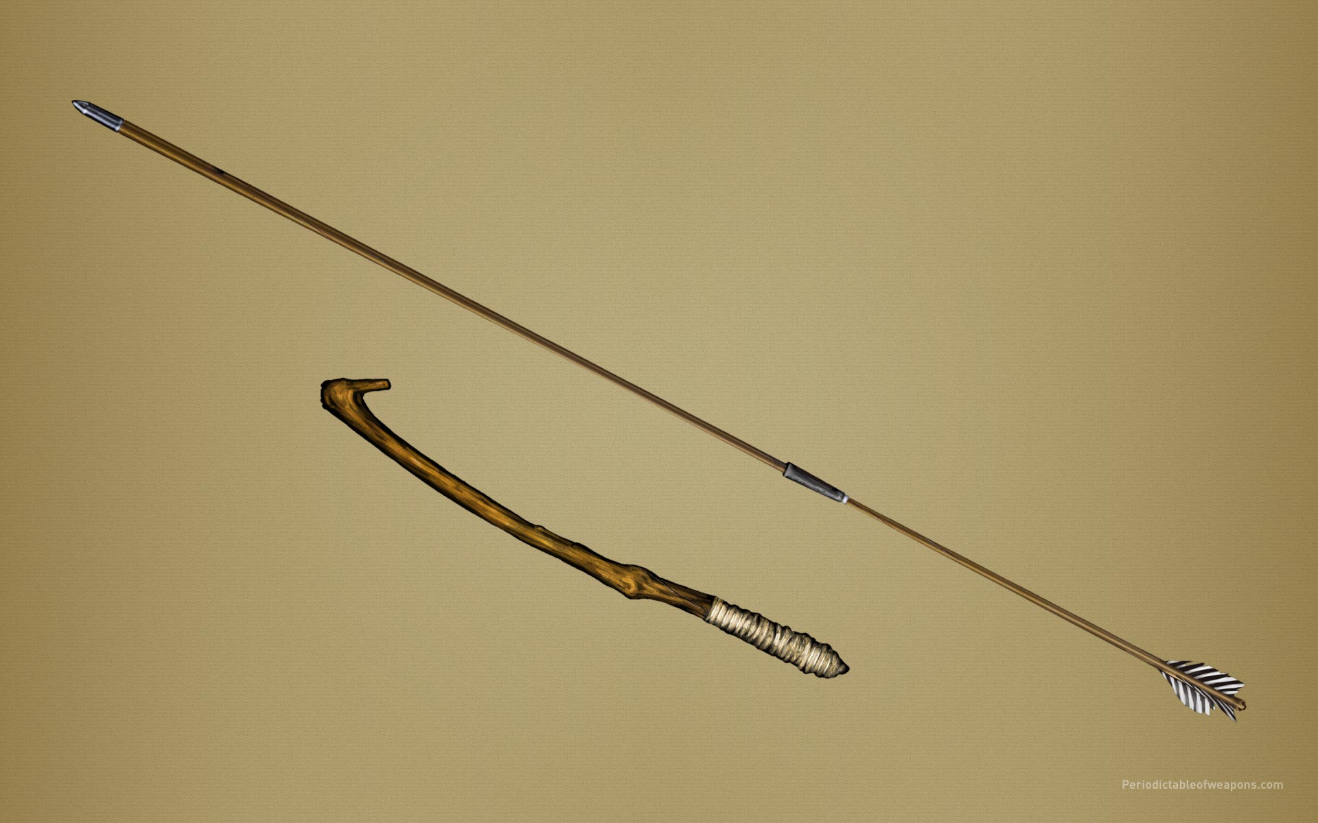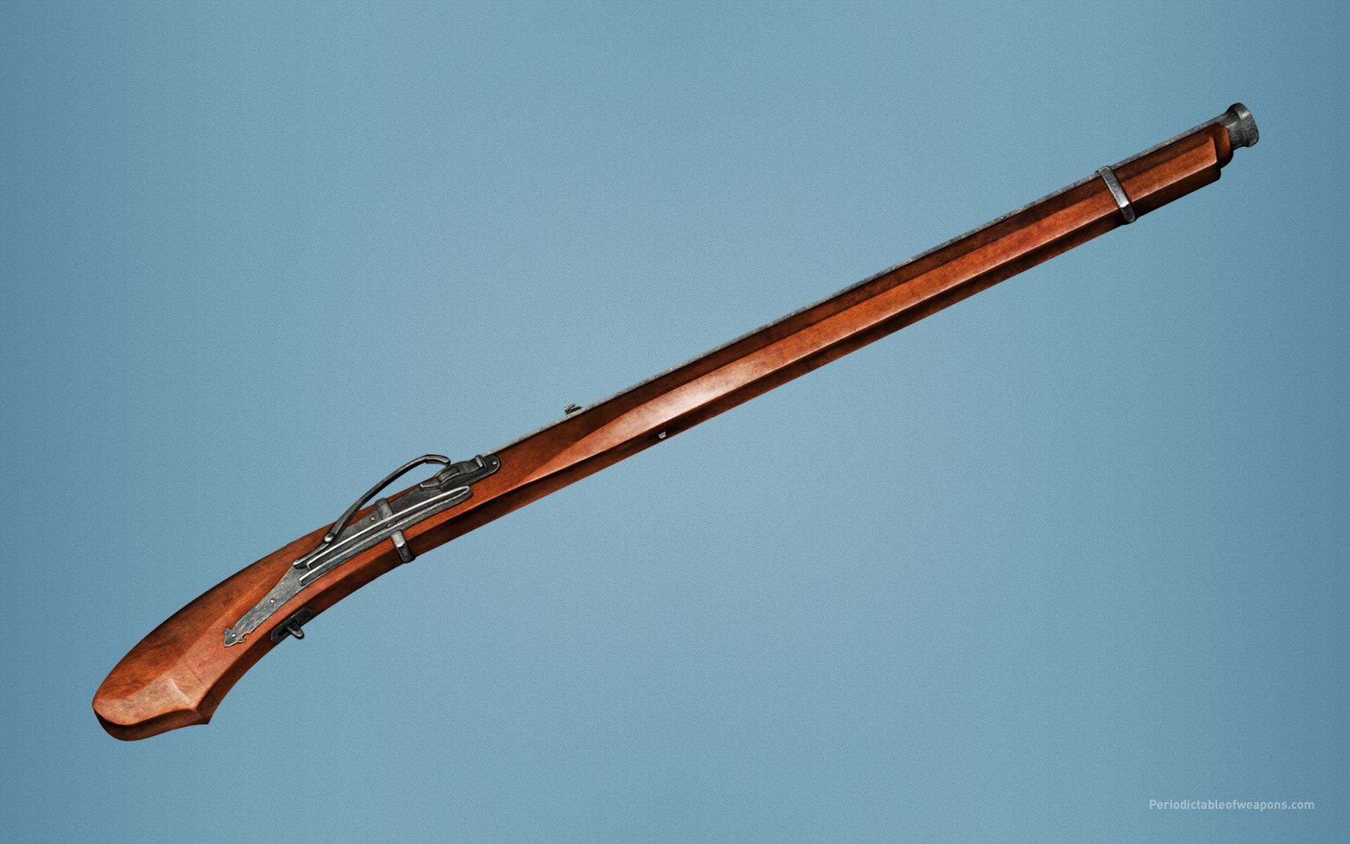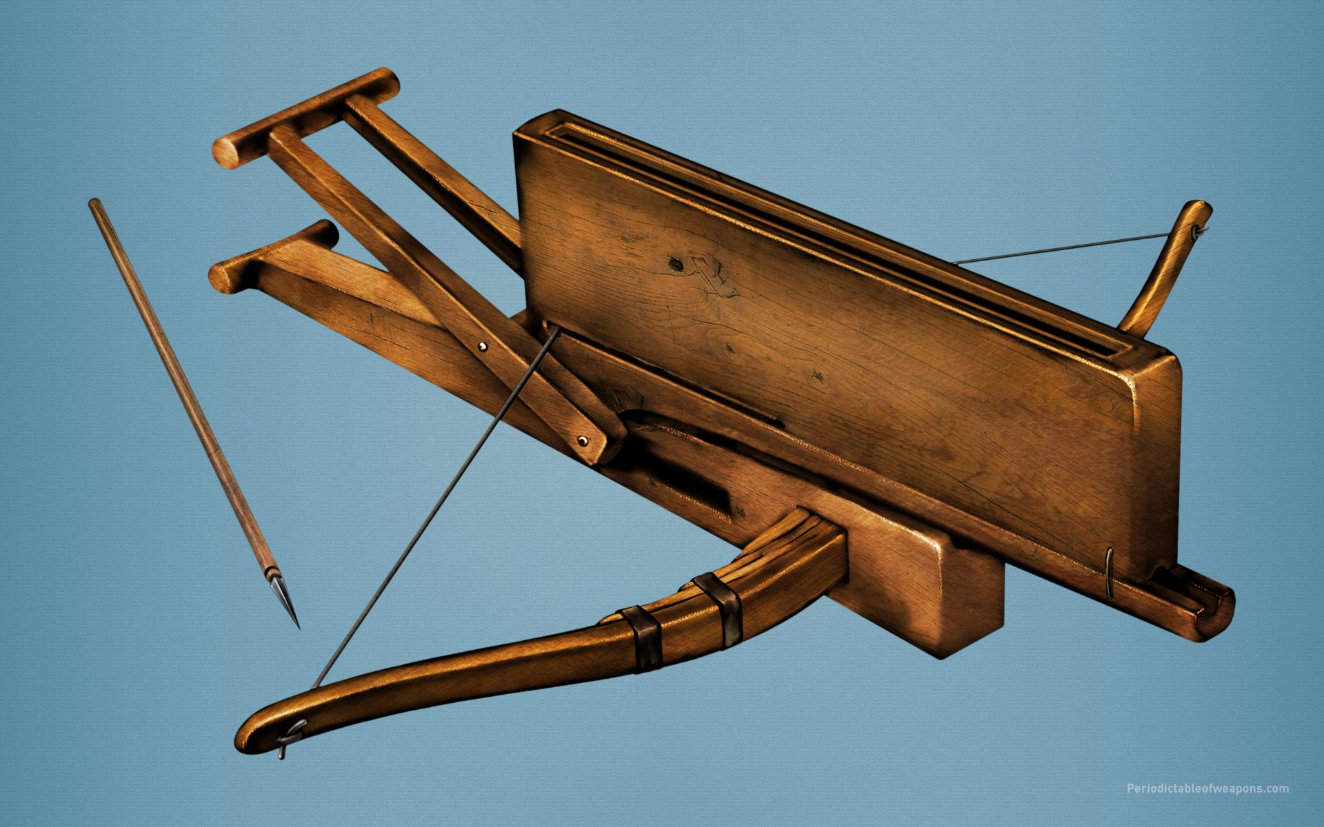 54 weapons illustrated and organized into a periodic table. Stone tools through automatic firearms, each one drawn from historical source artwork.