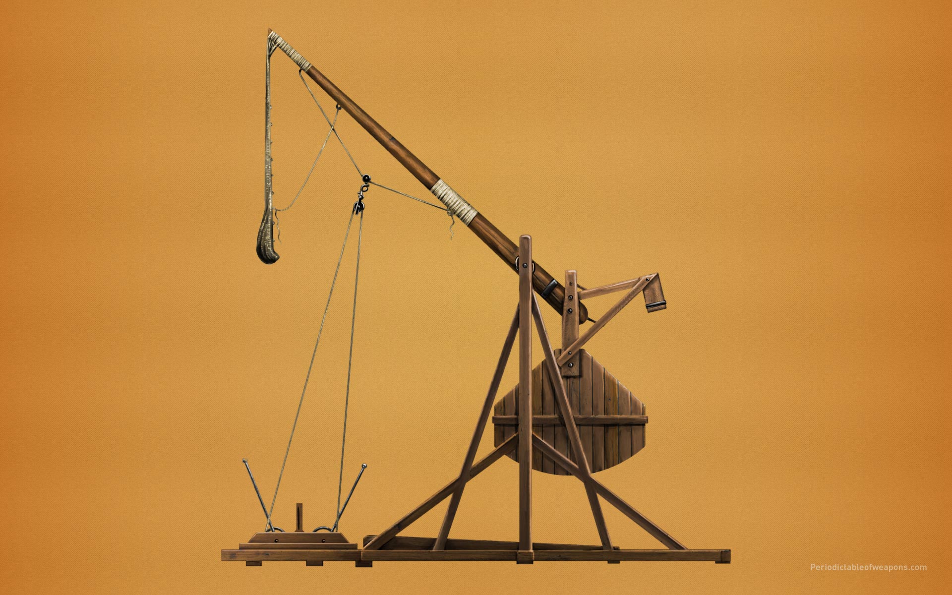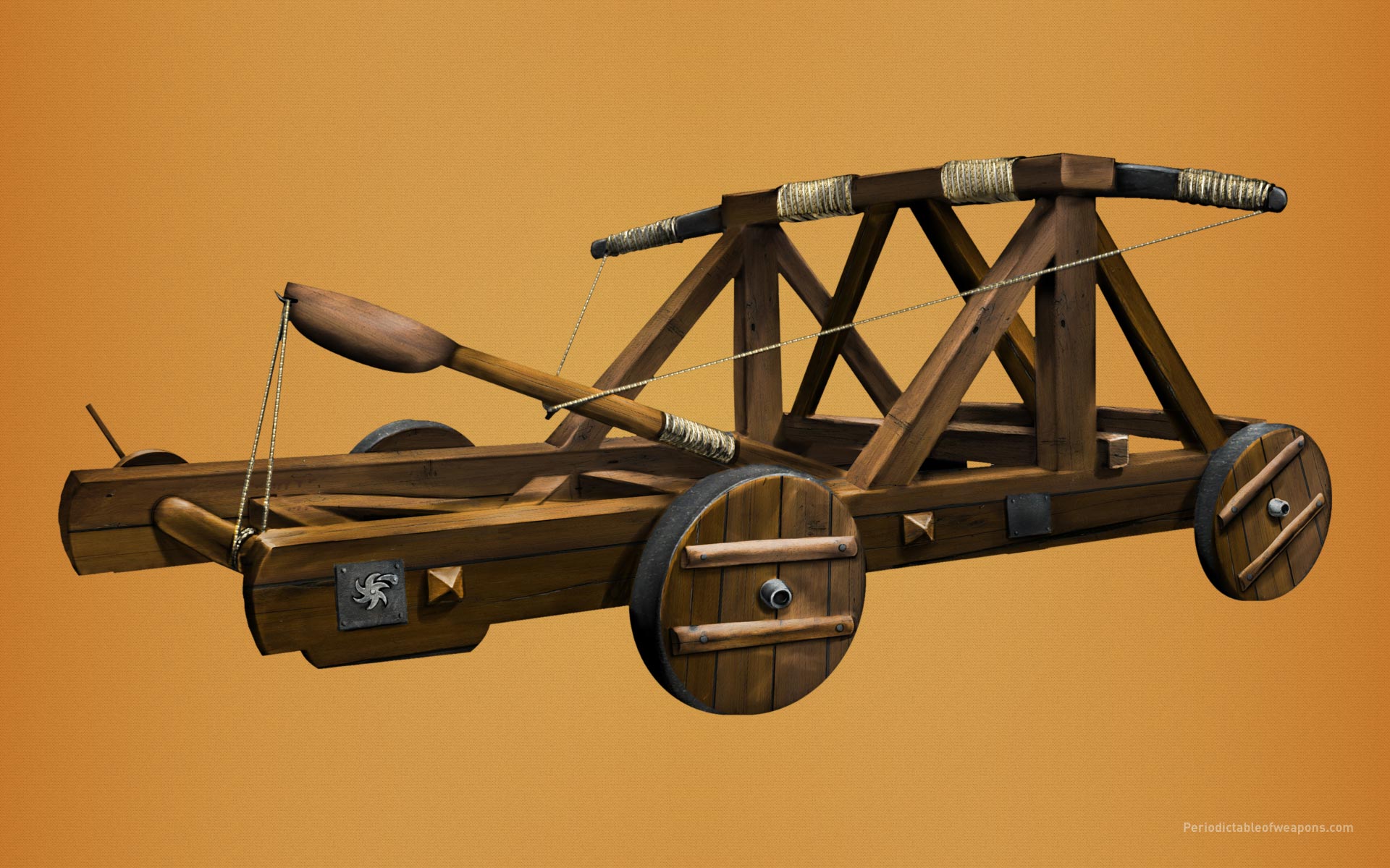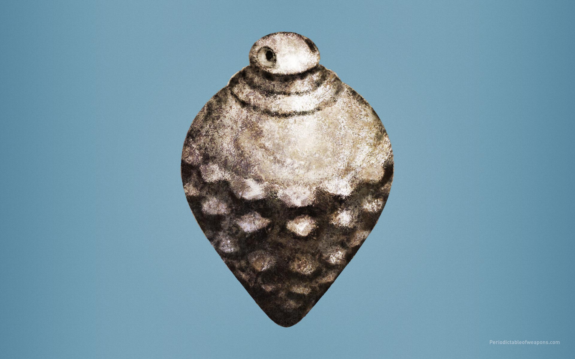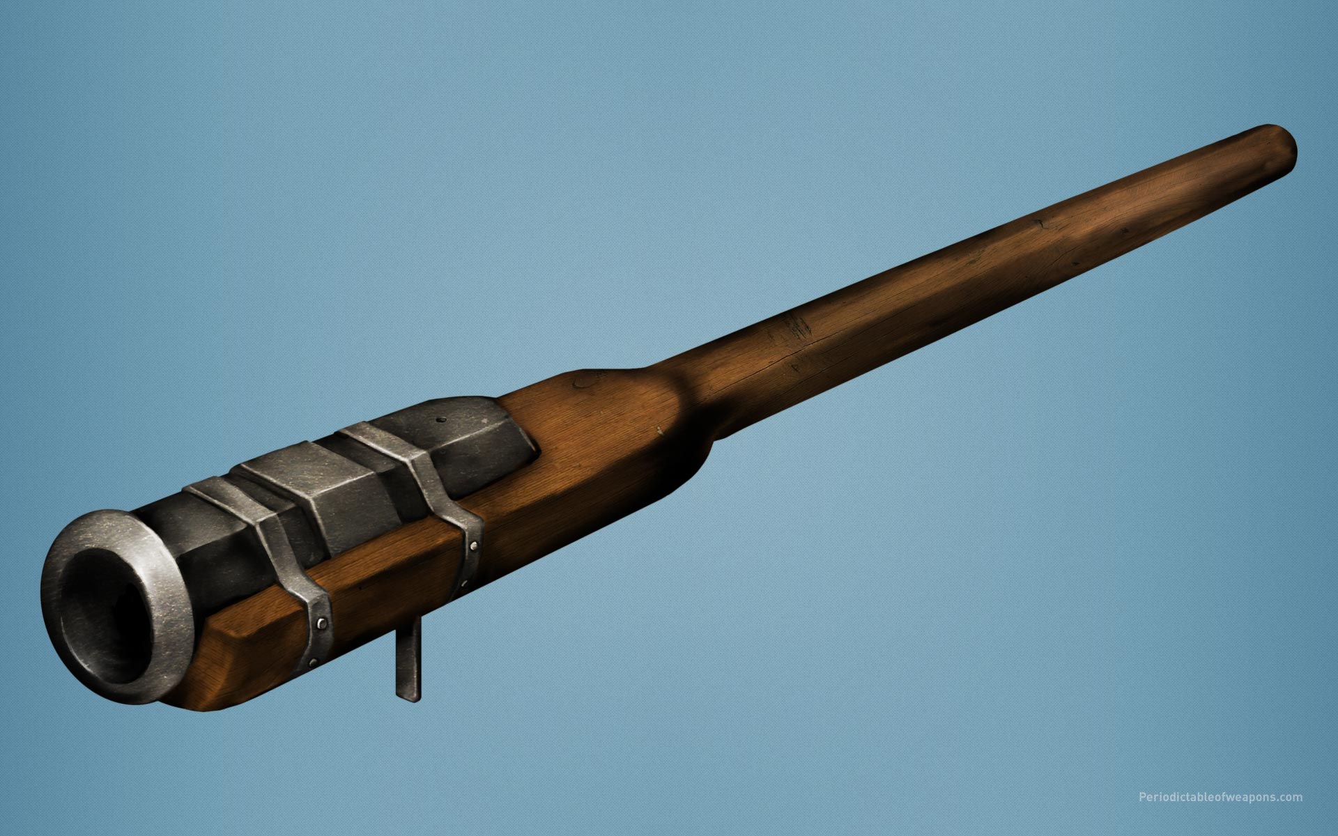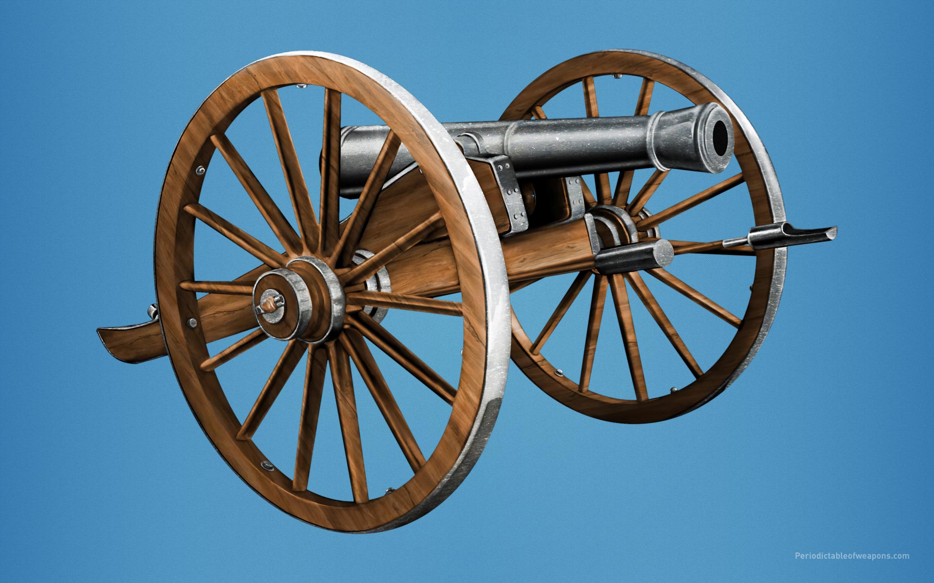 54 weapons illustrated and organized into a periodic table. Stone tools through automatic firearms, each one drawn from historical source artwork.